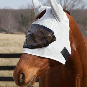 Dory, the resident brood mare, developed an eye problem which required full coverage from the sun. Thus, a fly mask with UV protection was developed. Please call or email for more information.